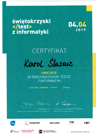 Dzisiejszy wpis będzie krótki. Chciałbym tylko pochwalić się zajęciem I miejsca w Świętokrzyskim Teście z Informatyki, którego głównymi organizatorami były: Kielecki Park Technologiczny oraz Politechnika Świętokrzyska, przy wsparciu Urzędu Miasta Kielce i firm z branży IT. (Możesz zajrzeć tu) Wyzwanie było naprawdę duże, ale zostało ono ujarzmione 🙂 Chciałbym tobie opowiedzieć co nieco o samym konkursie, jego przebiegu i nagrodach.